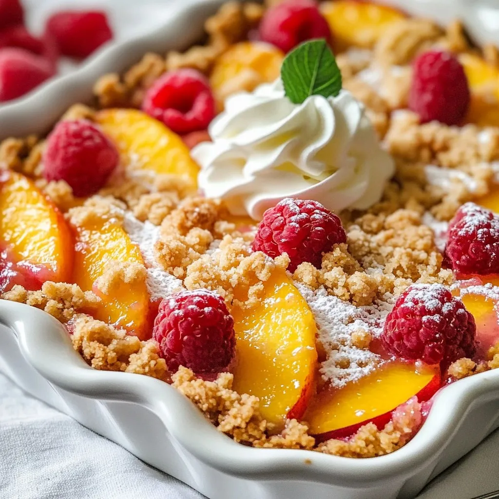 A delightful dessert featuring fresh peaches and raspberries topped with a buttery crumble.