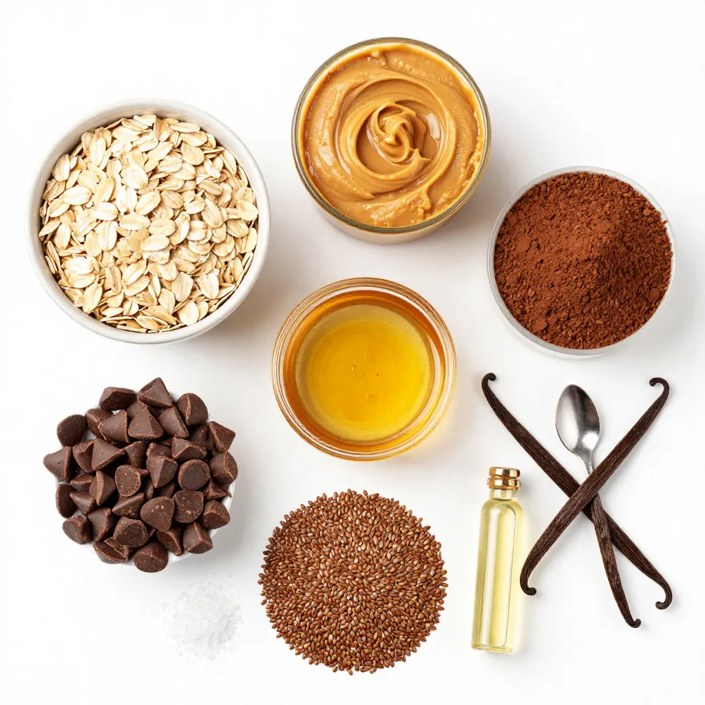 To start, grab a large mixing bowl. Add 1 cup of rolled oats. Then, scoop in 1/2 cup of natural peanut butter. Next, pour in 1/4 cup of honey or maple syrup. Don’t forget the 1 teaspoon of vanilla extract. Stir everything together. Mix until you see a smooth and even blend. Now, it’s time for the cocoa powder. Add 1/4 cup of unsweetened cocoa powder and 1/4 cup of ground flaxseed. Sprinkle in a pinch of salt. Mix again until the cocoa and flax are fully combined. Finally, fold in 1/4 cup of chocolate chips. This makes it extra tasty!
