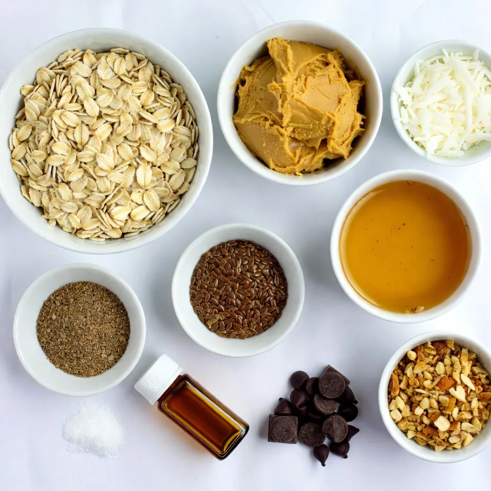 To start, gather your ingredients. You will need rolled oats, peanut butter, honey or maple syrup, ground flaxseed, dark chocolate chips, vanilla extract, and a pinch of salt. If you want extra texture, you can add shredded coconut or chopped nuts.