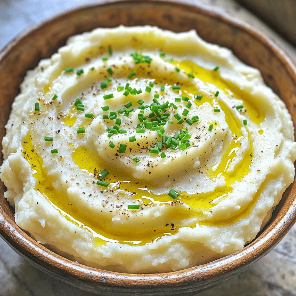Finally, transfer the mashed cauliflower to a serving bowl. For a beautiful touch, garnish it with chopped fresh chives. A drizzle of olive oil on top adds extra flair. Enjoy your creamy delight!