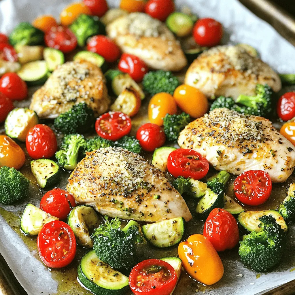 - 4 boneless, skinless chicken breasts - 1 cup broccoli florets - 1 cup cherry tomatoes, halved - 1 red bell pepper, sliced - 1 zucchini, sliced - 5 cloves garlic, minced - ½ cup grated Parmesan cheese - ¼ cup olive oil The key to this dish lies in using fresh, quality ingredients. The chicken breasts are the star here, and boneless, skinless pieces cook quickly and stay juicy. Broccoli, cherry tomatoes, red bell pepper, and zucchini not only add color but also pack in nutrients. I love using garlic for its bold flavor. Minced garlic paired with buttery Parmesan cheese creates a savory punch. Olive oil enhances the dish and helps everything roast to perfection. - 1 teaspoon dried oregano - 1 teaspoon Italian seasoning - Salt and pepper to taste - Fresh parsley for garnish (optional) Seasonings bring life to your sheet pan meal. Dried oregano and Italian seasoning add warmth and depth. Salt and pepper are crucial too; they enhance every bite. Fresh parsley can brighten the dish and add a pop of color. It’s optional but highly recommended for that extra flair. First, preheat your oven to 400°F (200°C). This step is key for even cooking. While the oven heats, line a large sheet pan with parchment paper. This makes cleanup easy and helps prevent sticking. Next, let's make the garlic and herb mixture. In a large bowl, combine ¼ cup of olive oil, 5 cloves of minced garlic, 1 teaspoon of dried oregano, and 1 teaspoon of Italian seasoning. Add salt and pepper to taste. Mix everything well until combined. Now, take your four boneless, skinless chicken breasts and place them in the bowl. Toss the chicken in the garlic mixture until it's coated evenly. This will infuse the chicken with great flavor. Once the chicken is ready, arrange the chicken breasts in the center of the sheet pan. In the same bowl, add your chopped veggies: 1 cup of broccoli florets, 1 cup of halved cherry tomatoes, 1 sliced red bell pepper, and 1 sliced zucchini. Toss the vegetables in the remaining garlic mixture until they are well-coated. Spread the seasoned veggies around the chicken on the sheet pan. For an extra touch, sprinkle ½ cup of grated Parmesan cheese evenly over the chicken and veggies. Now it’s time to roast! Place the sheet pan in the preheated oven and cook for 25-30 minutes. The chicken should reach an internal temperature of 165°F (75°C) and the veggies should be tender. If you want a golden finish, switch the oven to broil for the last 2-3 minutes. Keep a close eye on it to prevent burning. Once done, take the sheet pan out and let it rest for a few minutes before serving. If you like, garnish with fresh parsley for a pop of color. Enjoy your delicious meal! To ensure your chicken is safe and tasty, cook it all the way through. The best way to check this is by using a meat thermometer. Insert it into the thickest part of the breast. The chicken is done when it reaches 165°F (75°C). This step keeps your meal safe and juicy. Choosing the right vegetables makes a big difference. I love using fresh, colorful veggies like broccoli, cherry tomatoes, and bell peppers. They not only look great but also taste amazing. To avoid overcooking, cut your veggies into equal sizes. This helps them cook evenly. Remember, tender veggies are the goal, but they should still have a bit of crunch. When it comes to presentation, serve straight from the sheet pan for a cozy feel. If you want something fancier, use a large platter. Drizzle some olive oil on top and sprinkle with fresh parsley for a pop of color. It brings the dish to life! You can also pair this meal with a simple salad or some crusty bread to soak up all the flavors. Enjoy your delightful feast! {{image_2}} You can mix and match any veggies you like. Seasonal vegetables work great. Try asparagus in spring or squash in fall. These fresh choices add color and taste. If you’re short on time, frozen vegetables are a good option. They cook well and save you prep time. Just make sure to thaw them before using. You don’t have to stick with chicken. Try turkey or pork for a tasty twist. Both cook well and soak up flavors just like chicken. For a meat-free option, use chickpeas or tofu. These choices add protein and keep the meal filling. Spice it up by adding your favorite herbs. Rosemary or thyme can add depth. You can also try a kick with red pepper flakes. Want to switch up the cheese? Use feta or mozzarella for a different taste. Each cheese brings its own flavor, making your meal unique. Enjoy experimenting with these options! To keep your Roasted Garlic Parmesan Chicken Veggies fresh, follow these tips: - Refrigeration: Place leftovers in an airtight container. Store them in the fridge for up to 3 days. Make sure to cool them to room temperature before sealing. This helps avoid moisture build-up. - Freezing: For longer storage, freeze leftovers. Use freezer-safe containers or bags. They can last for up to 3 months. For best quality, label your containers with the date. When it's time to enjoy those leftovers, use these methods: - Best methods: Reheat the chicken and veggies in the oven for even warmth. Preheat your oven to 350°F (175°C). Place the food in a baking dish and cover it with foil. Heat for about 15-20 minutes. - Microwave: If short on time, the microwave works too. Place your food in a microwave-safe dish. Heat in 1-minute bursts, stirring in between, until hot. - Maintaining flavor and texture: To keep your chicken moist, add a splash of olive oil or broth before reheating. This helps prevent dryness. For veggies, a quick sauté in a pan with a bit of oil can bring back their crispness. Following these tips ensures your Roasted Garlic Parmesan Chicken and veggies taste great every time you enjoy them! To know if the chicken is done, check its internal temperature. Use a meat thermometer and aim for 165°F (75°C). Insert the thermometer into the thickest part of the chicken. If it reads 165°F, the chicken is safe to eat. Let it rest
