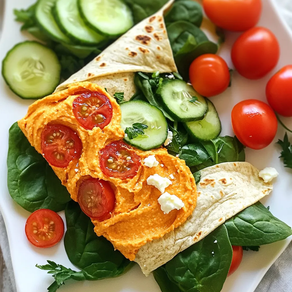 Now, take your large whole wheat tortillas. Lay them flat on a clean surface. Use a spatula or knife to spread a thick layer of the hummus on each tortilla. Leave a small space at the edges. Next, layer fresh spinach leaves, halved cherry tomatoes, and thin cucumber slices over the hummus. If you like cheese, sprinkle some feta on top.