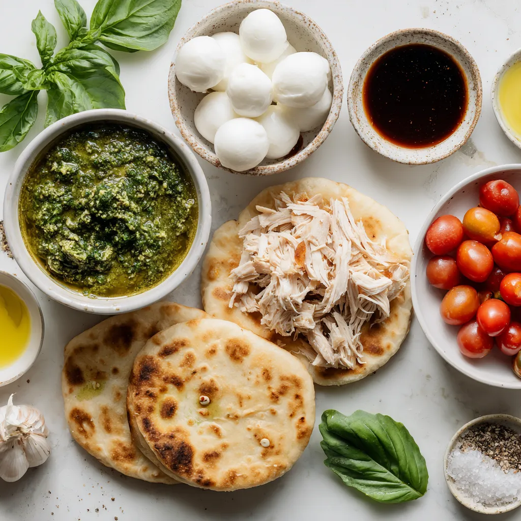 Each ingredient plays a key role in building flavor. The flatbread acts as a perfect base, crispy and warm. The shredded chicken gives protein and heartiness to the dish. Basil pesto adds a rich, herby taste that ties it all together.