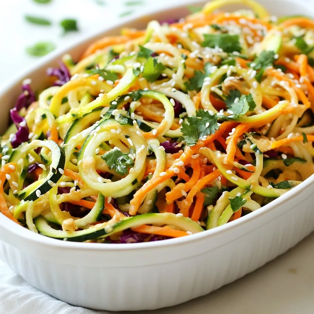 A refreshing and healthy salad made with spiralized zucchini noodles, colorful vegetables, and a creamy sesame peanut dressing.