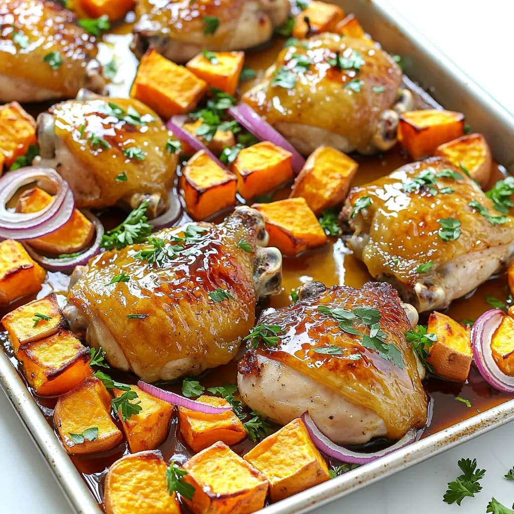 This dish brings together simple ingredients for a tasty meal. Chicken thighs are rich and juicy. Sweet potatoes add a sweet touch, while red onion gives a nice bite.