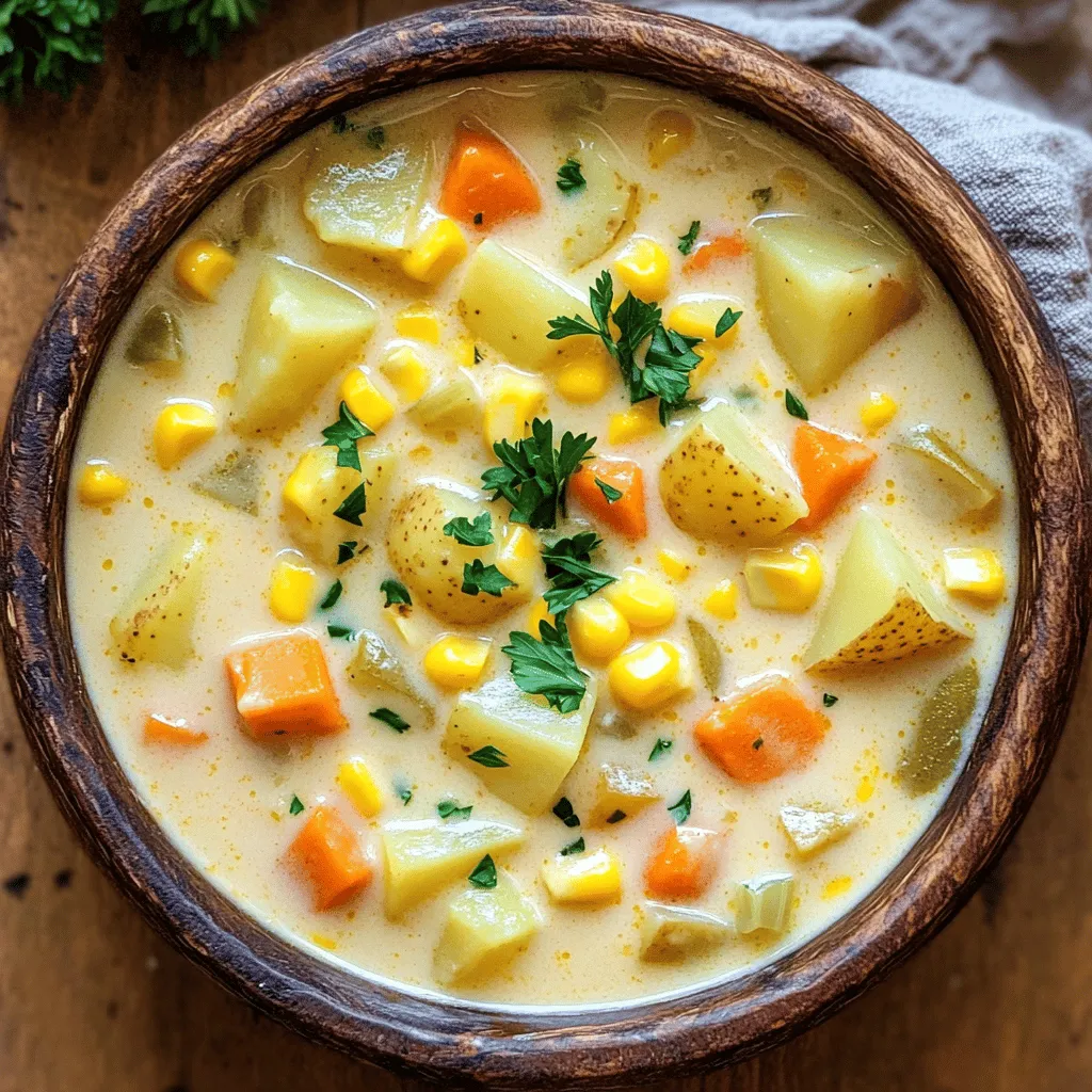 These main ingredients create a base full of flavor and nutrition. The vegetable broth provides a savory depth, while the potatoes and carrots add heartiness and sweetness. Corn brings a pop of texture, and the onion and garlic give a lovely aroma.