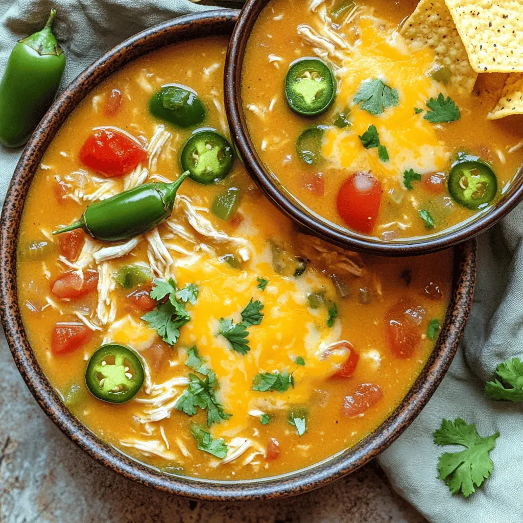 In this section, I’ll share the key ingredients you need for Slow Cooker Jalapeño Popper Chicken Soup. Each item brings a unique flavor that makes this soup a true delight. - 1 lb boneless, skinless chicken breasts - 4 cups chicken broth - 1 can (10 oz) diced tomatoes with green chilies - 1 cup cream cheese, softened - 1 cup shredded cheddar cheese - 1 cup corn (frozen or fresh) - 2 jalapeños, seeds removed and diced - 1 small onion, diced - 2 cloves garlic, minced - 1 teaspoon cumin - 1 teaspoon smoked paprika - Salt and pepper to taste - Fresh cilantro (for garnish) - Tortilla chips (for serving) Each ingredient serves a purpose. The chicken provides protein, while the broth adds depth. The tomatoes with green chilies give a kick of heat. Cream cheese and cheddar make the soup creamy and rich. Jalapeños bring a spicy twist, and corn adds a sweet crunch. When you gather these ingredients, think about freshness. Fresh vegetables and good-quality chicken can make a big difference in taste. If you want to customize this soup, you can swap the chicken for turkey or even beef. You can also make it dairy-free by using coconut cream instead of cream cheese. Use this list as your guide, and get ready to create a warm, comforting bowl of soup that everyone will love! 1. Start by placing the chicken breasts at the bottom of your slow cooker. This step ensures even cooking. 2. Next, add the chicken broth. It forms the base of the soup. 3. Now, stir in the diced tomatoes with green chilies, corn, jalapeños, onion, and garlic. Each ingredient adds its own flavor. 4. Season the mix with cumin, smoked paprika, salt, and pepper. These spices bring warmth and depth. 1. Cover the slow cooker with its lid. Cook on low for 6 hours or on high for 3 hours. This slow cooking helps the flavors blend well. 2. Once the chicken is cooked, remove it. Use two forks to shred it into bite-sized pieces. 3. Return the shredded chicken to the pot. 4. Add both the cream cheese and cheddar cheese. Stir until they melt and mix into the soup. 1. Taste the soup and adjust the seasoning as needed. You want it just right. 2. Let the soup cook on low for an additional 30 minutes. This step helps all the flavors meld together perfectly. Using frozen corn works well in this soup. It saves time and adds sweet flavor. Fresh corn can also be used if you prefer. Simply cut it off the cob. For cheese melting, add cream cheese first. Stir it in well before adding the cheddar cheese. This helps create a smooth and creamy texture. To adjust spice levels, add more or fewer jalapeños. If you like it spicy, include the seeds. For a milder soup, remove all seeds. You can add toppings like more cheese or crispy bacon. Fresh cilantro adds a nice touch too. Serve the soup in deep bowls for a great look. Garnish with fresh cilantro for color. A sprinkle of extra cheese works well too. Pair the soup with crunchy tortilla chips. They add a nice crunch and make it fun to eat. {{image_2}} You can switch up the meat in this soup. If you prefer turkey, use ground turkey instead of chicken. For a beef option, try shredded beef. Both will work well with the other flavors. If you need a dairy-free soup, there are options. Use a dairy-free cream cheese. You can also swap the cheddar cheese for a dairy-free version. This keeps the creamy taste without the dairy. To change the flavor, add spices like chili powder or cayenne pepper. These will give the soup a nice kick. Fresh herbs like thyme or oregano can also add depth to the taste. Incorporating other vegetables can make this soup more colorful. Try adding bell peppers, zucchini, or even spinach. Each will add its own unique flavor and texture. If you want a thicker soup, add more cream cheese or blend some of the soup. This will give it a rich and creamy texture. You can also add more corn for thickness. To make it brothier, simply add more chicken broth. This will make the soup lighter and easier to sip. Adjust the amount of cheese to keep the flavor balanced. You can decide if you want a creamy or chunky soup. For creamy, ensure all cheese melts well. If you prefer chunky, leave some chicken pieces and corn whole. Each way tastes great! After you make this soup, let it cool first. Place it in an airtight container. This helps keep the soup fresh. You can use glass or plastic containers. Glass is great for reheating, but plastic is lighter. Store the soup in the fridge for up to five days. To freeze the soup, let it cool completely. Pour it into freezer-safe bags or containers. Remove as much air as possible to avoid freezer burn. Label the bags with the date. You can freeze the soup for up to three months. When you want to eat it, thaw it overnight in the fridge. Reheat it on the stove or in the microwave. Stir it well to mix the ingredients. In the fridge, the soup lasts about five days. In the freezer, it can last up to three months. Check for signs of spoilage. If you see mold or a strange smell, throw it away. Always trust your senses. If something seems off, don't eat it. Cook this soup for 6 hours on low or 3 hours on high. The low setting lets the flavors blend well. It makes the chicken tender and juicy. If you are short on time, the high setting works just fine. I often suggest the low setting for the best taste. Yes, you can make this soup ahead. Prepare it and let it cool. Store it in the fridge for up to three days. When you are ready to eat, reheat it on the stove or in the microwave. Stir well to make sure it heats evenly. For leftovers, let the soup cool first. Use an airtight container for best results. This keeps the soup fresh longer. Store it in the fridge for up to three days. If you want to keep it longer, freeze it in portions. Just thaw and reheat when ready to enjoy. The spice level depends on the jalapeños. If you like it mild, remove all the seeds and membranes. For more heat, leave some seeds in. You can also add extra jalapeños or hot sauce to increase the spice. A