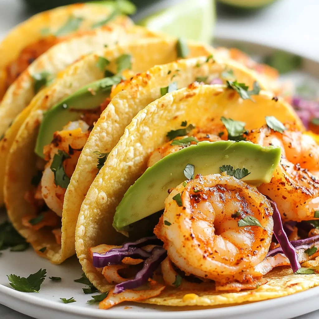 Here are the key ingredients for Spicy Cajun Shrimp Tacos: - 1 pound shrimp, peeled and deveined - 2 tablespoons Cajun seasoning - 1 tablespoon olive oil - 1 cup red cabbage, shredded - 1 avocado, sliced - 1/4 cup fresh cilantro, chopped - 1 lime, juiced - 8 small corn tortillas - Salt and pepper to taste - Optional: sour cream or Greek yogurt for topping You can swap some ingredients if needed. Try these options: - Use chicken or tofu instead of shrimp. - Substitute green cabbage for red cabbage. - Swap lime juice with lemon juice. - Use any fresh herbs, like parsley, in place of cilantro. - Try Greek yogurt instead of sour cream for a tangy twist. I love to serve these tacos with a few sides. Here are some ideas: - Pair with rice or quinoa for a filling meal. - Add a side of black beans for extra protein. - Serve with a fresh salad on the side. - Offer extra lime wedges for a zesty touch. - For a fun twist, serve with tortilla chips and salsa. {{ingredient_image_1}} Start by rinsing the shrimp under cold water. This helps remove any grit. Next, take a medium bowl and add the peeled and deveined shrimp. Sprinkle in the Cajun seasoning. Toss the shrimp well until they are fully coated. This step adds flavor to every bite. Heat olive oil in a skillet over medium-high heat. Once the oil is hot, add the shrimp. Cook them for 2 to 3 minutes per side. You will know they are done when they turn pink and opaque. This means they are cooked through. Remove the shrimp from heat and set them aside. Now it's time to build your tacos! First, warm the corn tortillas in a dry skillet. Heat them for about 30 seconds on each side. This makes them soft and easy to fold. Next, place a good amount of shredded red cabbage on each tortilla. Then, add the cooked Cajun shrimp on top. Follow this with slices of avocado and chopped cilantro. Squeeze fresh lime juice over the tacos. Finally, season with salt and pepper to taste. If you like, add a dollop of sour cream or Greek yogurt on top for creaminess. Enjoy your tasty creation! To cook shrimp just right, start with fresh or thawed shrimp. Pat them dry to remove excess moisture. This helps them sear nicely. Toss the shrimp with Cajun seasoning in a bowl. Make sure they get an even coat. Heat olive oil in a skillet over medium-high heat. When the oil is hot, add the shrimp. Cook for 2-3 minutes on each side. They should turn pink and opaque. Remove them quickly when done to avoid overcooking. For the best taco experience, use small corn tortillas. They add a nice flavor and texture. Warm them in a dry skillet for about 30 seconds on each side. You can also use flour tortillas if you prefer a softer bite. Make sure they are pliable, so they hold the shrimp and toppings well. To make your tacos even tastier, add fresh lime juice right before serving. It brightens the flavors. You can also include slices of avocado for creaminess. Fresh cilantro adds a pop of color and flavor. If you like it creamy, add a dollop of sour cream or Greek yogurt. These extras will take your Spicy Cajun Shrimp Tacos to the next level! Pro Tips Perfectly Cooked Shrimp: Cook the shrimp just until they turn pink and opaque to avoid overcooking, which can make them rubbery. Homemade Cajun Seasoning: Consider making your own Cajun seasoning blend for a fresher taste. Combine paprika, cayenne, garlic powder, and dried herbs for a customizable flavor. Warm Tortillas: Keep your corn tortillas warm in a clean kitchen towel after heating them to prevent them from drying out before serving. Fresh Ingredients: Use fresh lime juice and ripe avocados for the best flavor and texture in your tacos. {{image_2}} You can swap ingredients to match your taste or what you have. If you cannot find shrimp, chicken or fish works well too. You can use chicken breast, diced and cooked in the same way. For a lighter touch, try using zucchini or bell peppers instead of shrimp. Instead of red cabbage, you can use green cabbage or even lettuce for crunch. If you want more creaminess, swap avocado for guacamole or a creamy dressing. To make these tacos vegan or vegetarian, skip the shrimp. Instead, use black beans or chickpeas. They provide protein and flavor. You can also add tofu for a nice texture. Season them with Cajun spices just like the shrimp. For toppings, keep the avocado and cilantro, and add some diced tomatoes or corn for more color and taste. If you love heat, add more Cajun seasoning to your shrimp. You can also mix in some hot sauce or diced jalapeños. For a milder taste, use less seasoning. You can also add a dollop of sour cream or Greek yogurt to cool down the heat. If you are making these for kids, go light on the spice. Let each person add their own heat, so everyone is happy! To keep your Spicy Cajun Shrimp Tacos fresh, store leftovers in an airtight container. Place the shrimp, toppings, and tortillas in separate containers. This way, the tortillas won't get soggy. You can store them in the fridge for up to two days. When you are ready to eat the leftovers, reheat the shrimp in a skillet. Use medium heat for about 2-3 minutes, or until they are hot. Warm the tortillas in a dry skillet for about 30 seconds on each side. This helps them stay soft and pliable. If you want to save the shrimp tacos for later, freeze the cooked shrimp. Place them in a freezer-safe bag or container. Remove as much air as you can to prevent freezer burn. You can freeze the shrimp for up to three months. When ready to eat, thaw in the fridge overnight and reheat as mentioned above. You can serve these tacos with a fresh salad or rice. A simple green salad adds crunch. You might try coleslaw for more texture. Rice with lime or cilantro works well too. Don't forget fresh salsa or guacamole for extra flavor! Yes, you can use frozen shrimp. Just be sure to thaw them first. Place them in cold water for about 15 minutes. Drain them well before seasoning. This keeps the shrimp juicy and tasty. To make Cajun seasoning at home