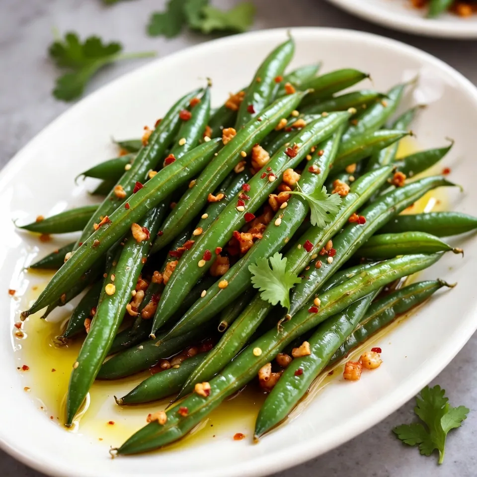 - 1 pound fresh green beans, trimmed - 3 tablespoons olive oil - 4 cloves garlic, minced - 1 teaspoon red pepper flakes (adjust for heat preference) - 2 tablespoons soy sauce (low sodium) - 1 tablespoon rice vinegar - 1 teaspoon sesame oil - Salt and pepper to taste - 2 tablespoons toasted sesame seeds (for garnish) - Fresh cilantro or green onions (for garnish) The fresh green beans are the star of the dish. They add a nice crunch and bright color. I love using olive oil for cooking; it gives a rich flavor. Minced garlic brings an amazing aroma and taste. For seasoning, I like red pepper flakes for heat. You can add more or less to fit your taste. Low-sodium soy sauce adds depth and a savory touch. Rice vinegar gives a nice tang. Sesame oil adds a nutty flavor that really stands out. To finish, I sprinkle toasted sesame seeds on top for crunch. Fresh herbs like cilantro or green onions add a pop of color and freshness. This mix of ingredients creates a dish that is both simple and delicious. {{ingredient_image_1}} 1. Blanching the green beans: Start by bringing a large pot of salted water to a boil. Add 1 pound of fresh green beans to the pot. Cook for 2-3 minutes. You want them bright green and tender-crisp. 2. Ice bath to stop cooking: After blanching, drain the green beans. Quickly plunge them into a bowl of ice water. This step will stop the cooking process and keep the beans crisp. Once cooled, drain them again and set aside. 1. Heating olive oil and sautéing garlic: In a large skillet or wok, heat 3 tablespoons of olive oil over medium-high heat. Once the oil is hot, add 4 cloves of minced garlic. Sauté for about 30 seconds until you smell the garlic. Be careful not to burn it! 2. Adding red pepper flakes for flavor: Stir in 1 teaspoon of red pepper flakes. Cook for an additional 15 seconds. This brings out the heat and flavor. 1. Tossing green beans in garlic oil: Add the blanched green beans to the skillet. Toss them well in the garlic and oil mixture. This step coats the beans with flavor. 2. Adding soy sauce, vinegar, and sesame oil: Pour in 2 tablespoons of soy sauce, 1 tablespoon of rice vinegar, and 1 teaspoon of sesame oil. Stir well to combine everything. Cook for about 3-4 minutes until heated through. 3. Final seasoning and presentation: Season with salt and pepper to taste. Remove from heat. Transfer the spicy garlic green beans to a serving platter. Sprinkle with 2 tablespoons of toasted sesame seeds. Garnish with fresh cilantro or sliced green onions for a pop of color. To get the spice just right, adjust the red pepper flakes. Start with one teaspoon. If you like it hotter, add more. Always taste as you go. This helps you find your perfect heat level. Stopping the cooking process is key. After blanching the green beans, plunge them into ice water. This keeps them bright green and crisp. Drain them well before cooking. This step makes the green beans stay fresh and crunchy. For plating, use a white platter. The bright green beans pop against the white. This makes your dish look more inviting. Drizzle a bit of sesame oil on top for shine. Spicy garlic green beans pair well with grilled chicken or tofu. They also complement rice dishes. Try them with stir-fried beef for a flavor boost. This side dish fits many meals and adds zest. For extra flavor, consider adding ginger or lime juice. Both options can elevate the dish. Fresh ginger gives a nice kick, while lime adds brightness. You can also try different oils. Instead of olive oil, use avocado oil for a lighter taste. Coconut oil can add a hint of sweetness. Each oil gives a unique twist to the same recipe. Pro Tips Choose Fresh Green Beans: Look for vibrant green beans that are firm to the touch. Fresh beans will have a better flavor and texture. Adjust Spice Level: Feel free to increase or decrease the red pepper flakes based on your heat preference. Start with a small amount and add more if desired. Perfect Sautéing: Keep the heat at medium-high when sautéing garlic to prevent it from burning. Garlic should be fragrant and lightly golden. Garnish for Flavor: Fresh herbs like cilantro or green onions not only add color but also enhance the dish's flavor profile. Don't skip this step! {{image_2}} You can mix things up by using different veggies in this recipe. Snap peas and asparagus work great. They add a nice crunch and color. You can also try broccoli or bell peppers. Each option gives a unique taste. Just cook them the same way you do for green beans. This keeps the dish fresh and exciting. Want to give your green beans a new flavor? Try adding different sauces. Teriyaki sauce adds a sweet twist. Hoisin sauce gives a rich, savory taste. Both sauces mix well with garlic. If you like some crunch, toss in nuts. Toasted almonds or cashews add great texture. These changes make the dish your own. Making this dish vegan? Use soy sauce that is gluten-free. You can also swap rice vinegar for apple cider vinegar. For those watching salt, low-sodium soy sauce works well. These small changes keep the flavor while fitting your diet. Don't worry; it will still taste amazing! - Use airtight containers. Glass or plastic works well. - Keep in the fridge for up to three days. - Let the green beans cool before sealing them. - Use a skillet or pan to reheat. - Warm on medium heat for best results. - Add a splash of olive oil to keep them moist. - Stir often for even heating and to keep flavor. - Place cooled green beans in freezer bags. - Remove as much air as possible before sealing. - Store in the freezer for up to three months. - To thaw, move them to the fridge overnight or use cold water. - Reheat in a pan or microwave, but avoid overcooking. You can enjoy spicy garlic green beans with many dishes. They pair well with: - Grilled chicken or beef - Stir-fried tofu - Rice or quinoa - Noodles or pasta - Asian-style fish These sides make your meal balanced and tasty. The beans add a crunchy texture and a kick of flavor. Yes, you