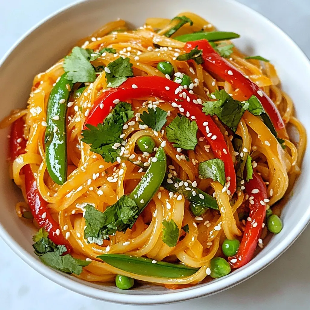 A quick and flavorful stir-fry featuring rice noodles, garlic, and vibrant vegetables with a spicy kick.