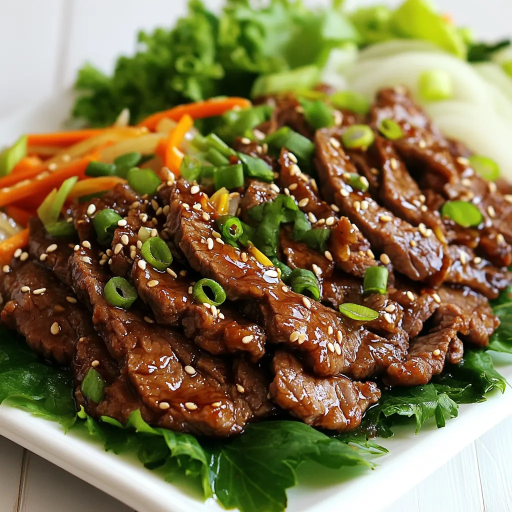 Serve the bulgogi on a large platter using leafy greens to wrap the beef and vegetables, allowing guests to create their own wraps. Garnish with extra green onions and sesame seeds for a vibrant finish.