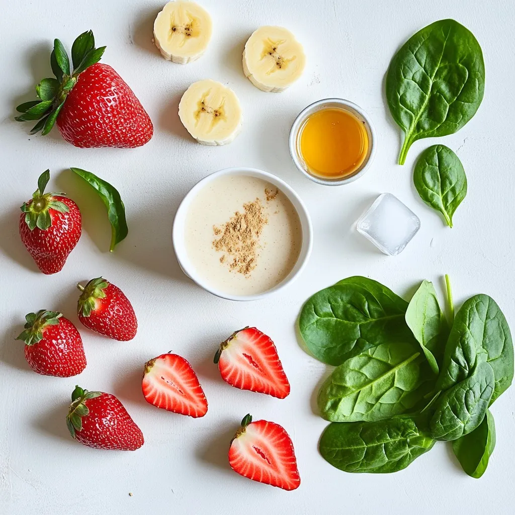 To make this smoothie, start with fresh strawberries. Wash them well, hull them, and cut them in half. Next, peel your ripe banana and add it to the blender. Pour in one cup of almond milk. If you want a thicker smoothie, use less milk. For a creamier taste, add one scoop of vanilla protein powder. You can also add one tablespoon of almond butter for extra flavor. If you like it sweeter, toss in honey or maple syrup. For added nutrition, include half a cup of spinach. Lastly, add ice cubes based on how thick you want it. Blend everything on high until smooth and creamy. If needed, stop the blender and scrape the sides to mix well. Once blended, taste it and adjust the sweetness or thickness.