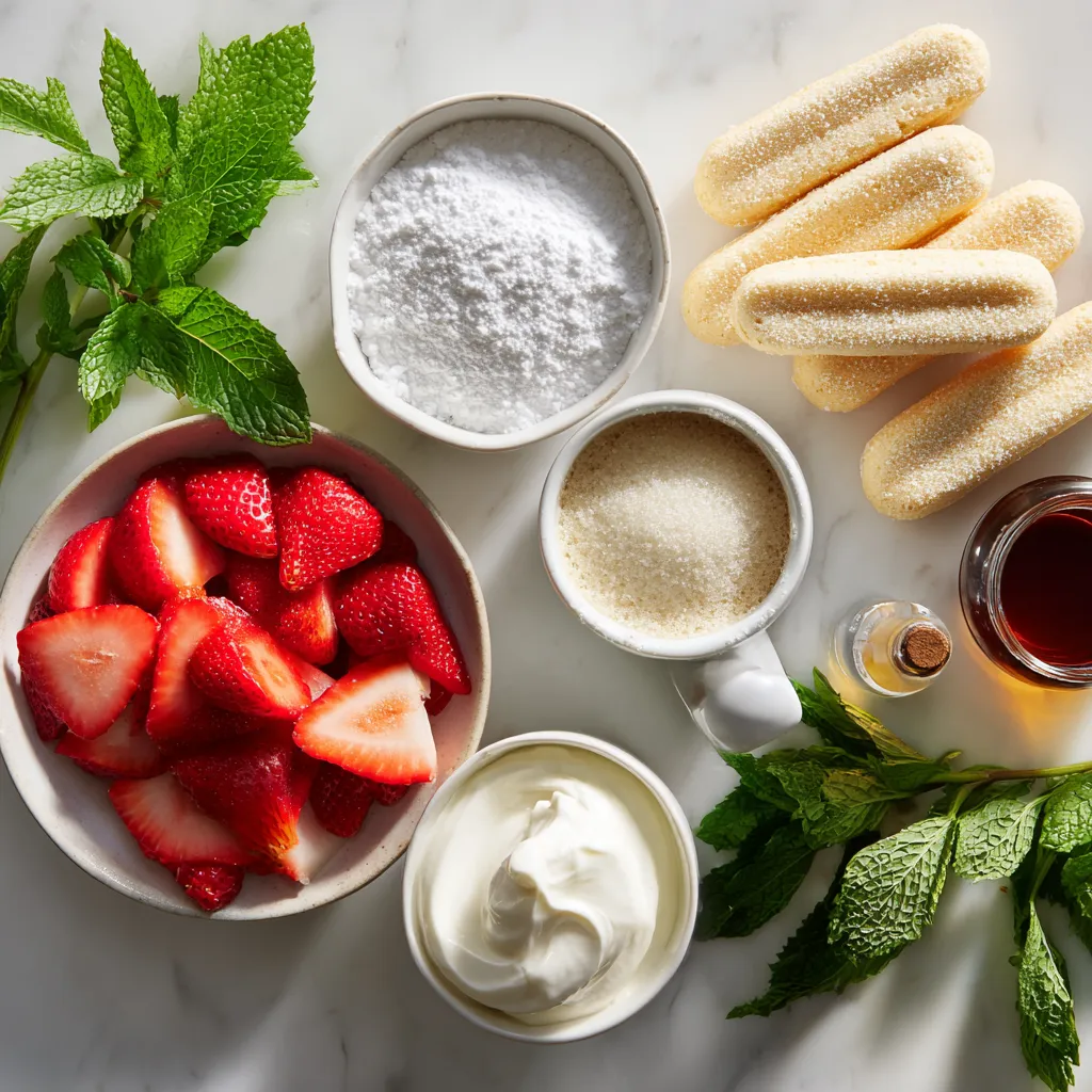 Vanilla extract brings a nice flavor to the cream. Ladyfinger cookies serve as the cake’s base. These cookies soak up the strawberry juices well. Lastly, fresh mint leaves are optional but add a bright touch when you serve.