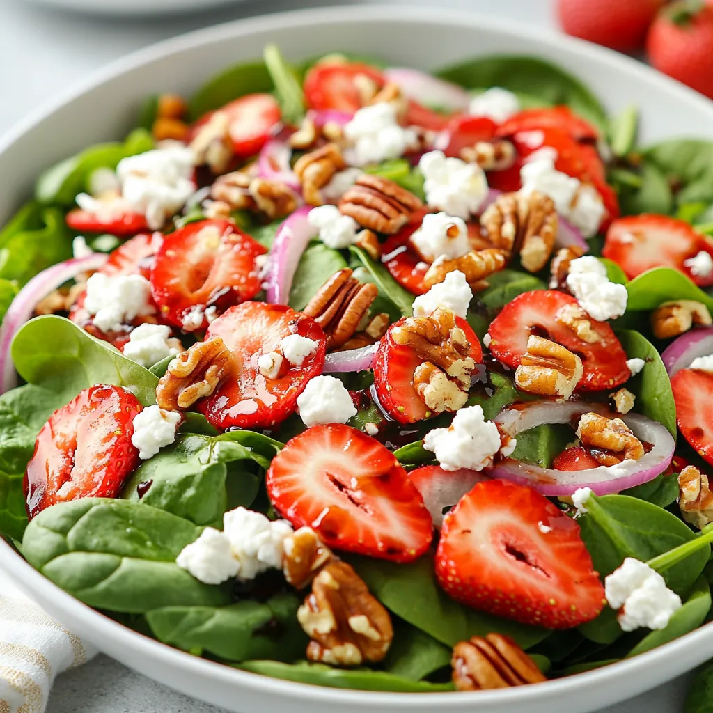 Serve the salad in a large bowl for sharing or on individual plates. For a nice touch, garnish with extra strawberry slices and a sprinkle of goat cheese on top. This makes it look inviting. You can also add some grilled chicken or shrimp for extra protein. If you want to make it a meal, serve it with crusty bread or a light soup. Enjoy this salad fresh to appreciate all its flavors!