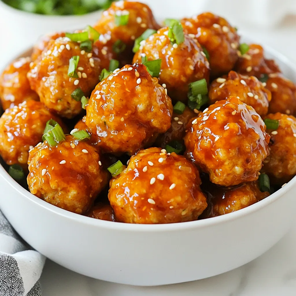 - 1 pound ground chicken - 1/2 cup breadcrumbs - 1/4 cup minced green onions - 2 cloves garlic, minced - 1 teaspoon ginger paste - 1 egg, beaten - Salt and pepper to taste - 1 tablespoon sesame oil To make the meatballs, I mix ground chicken with breadcrumbs. The breadcrumbs help bind the meatballs together. I add minced green onions for a fresh taste. Garlic gives a strong flavor, while ginger adds warmth. The beaten egg helps hold everything together. Season with salt and pepper for taste. Finally, sesame oil gives a nice nutty essence. - 1/2 cup pineapple juice - 1/4 cup rice vinegar - 1/4 cup ketchup - 1/4 cup brown sugar - 1 tablespoon soy sauce - 1 teaspoon cornstarch mixed with 2 tablespoons water (slurry) For the sweet and sour sauce, I start with pineapple juice. It adds sweetness and tang. Rice vinegar provides acidity, balancing the flavors. Ketchup brings in extra sweetness, while brown sugar deepens the flavor. Soy sauce adds a savory touch. Finally, I use cornstarch mixed with water to thicken the sauce. - Extra green onions - Sesame seeds For garnishes, I suggest extra green onions. They add color and freshness. Sesame seeds give a nice crunch and look appealing. {{ingredient_image_1}} - Preheating the oven and prepping the baking sheet: First, set your oven to 400°F (200°C). Line a baking sheet with parchment paper. This helps prevent sticking and makes cleanup easy. - Mixing the ingredients: In a large bowl, combine 1 pound of ground chicken, 1/2 cup of breadcrumbs, 1/4 cup of minced green onions, and 2 cloves of minced garlic. Add 1 teaspoon of ginger paste, 1 beaten egg, and 1 tablespoon of sesame oil. Season with salt and pepper to taste. Mix everything well until it’s fully combined. - Shaping the meatballs: Now, use your hands to shape the mixture into 1-inch meatballs. Place them on the prepared baking sheet, leaving space between each ball to allow for even cooking. - Setting the baking time and temperature: Place the baking sheet in the preheated oven. Bake the meatballs for about 20 minutes. They should be golden brown and cooked through. - Checking for doneness: To check if the meatballs are done, cut one open. The center should be white and hot. If not, bake for a few more minutes. - Combining sauce ingredients in a saucepan: While the meatballs bake, prepare the sweet and sour sauce. In a saucepan over medium heat, mix together 1/2 cup of pineapple juice, 1/4 cup of rice vinegar, 1/4 cup of ketchup, 1/4 cup of brown sugar, and 1 tablespoon of soy sauce. Stir well and bring to a gentle boil. - Thickening the sauce with cornstarch slurry: Once the sauce boils, reduce the heat. Stir in 1 teaspoon of cornstarch mixed with 2 tablespoons of water. Cook for 2-3 minutes until the sauce thickens slightly. This makes it rich and sticky, perfect for coating the meatballs. To avoid dryness in meatballs, use ground chicken that has some fat. Fat keeps the meatballs moist and tender. Mixing in breadcrumbs also helps lock in moisture. When shaping your meatballs, be gentle. Overworking the meat can make them tough. To cook evenly and get that golden brown color, bake your meatballs at 400°F (200°C). This high heat helps them brown nicely. Place them on a parchment-lined baking sheet. Space them out to allow heat to circulate. Balancing sweetness and acidity is key to a great sauce. Start with pineapple juice and rice vinegar for a bright flavor. If the sauce is too sweet, add more vinegar. If it’s too sour, increase the brown sugar. Taste as you go to find your perfect balance. Substituting ingredients can create new flavors. Try orange juice instead of pineapple for a citrus twist. You can also use apple cider vinegar instead of rice vinegar for a different acidity. For the best side dishes, serve steamed rice or fried rice with the meatballs. Both pair well with the sweet and sour flavors. You might also enjoy a fresh salad for a nice crunch. For a beautiful serving platter, layer the meatballs in the center. Drizzle the sweet and sour sauce on top for an eye-catching look. Garnish with extra green onions or sesame seeds for a pop of color. Pro Tips Use Fresh Ingredients: Fresh ground chicken and vegetables will enhance the flavor of your meatballs significantly. Adjust Sweetness: Feel free to adjust the amount of brown sugar in the sauce according to your taste preference. Experiment with Spices: Adding a pinch of red pepper flakes can give your meatballs an extra kick of heat! Make Ahead: You can prepare the meatballs and sauce in advance, refrigerate them, and just heat them up before serving! {{image_2}} You can swap ground chicken for other meats. Ground turkey works well and keeps it light. Ground pork brings a richer taste and pairs nicely with the sauce. If you want a meat-free option, try using plant-based meats. Lentils or chickpeas also make great choices. They add flavor and texture that everyone will enjoy. Want to spice things up? Add chili sauce or fresh peppers to the meat mixture. Just a little can bring heat to your meal. You can also mix in vegetables like bell peppers or carrots. This not only boosts nutrition but adds crunch and color to your meatballs. If you want a twist on flavor, try teriyaki sauce. It gives a sweet and savory taste that complements the meatballs. Sweet chili sauce is another tasty option. It adds a bit of heat and sweetness for a delightful change. Mixing sauces can take your dish to a whole new level! To keep your sweet and sour chicken meatballs fresh, follow these tips: - Let the meatballs cool completely before storing. - Place them in airtight containers. - Use glass or plastic containers with tight lids. - For longer storage, wrap them in plastic wrap first. - Label containers with the date. When you're ready to enjoy leftovers, use these reheating methods: - Microwave: Place meatballs on a plate and cover with a damp paper towel. Heat in 30-second intervals until warm. - Oven: Preheat to 350°F (175°C). Place meat