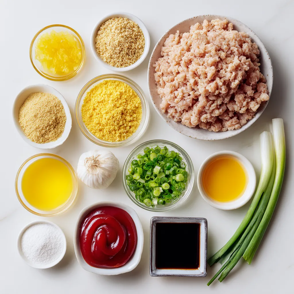 • In a large mixing bowl, combine the ground chicken, breadcrumbs, green onions, minced garlic, ginger paste, beaten egg, sesame oil, salt, and pepper. Mix until all ingredients are well incorporated.
