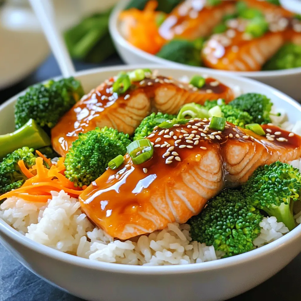 - 2 salmon fillets (about 5 oz each) - 1 cup jasmine rice - 1/4 cup low-sodium soy sauce - 2 tablespoons honey - 1 tablespoon rice vinegar - 1 tablespoon sesame oil - 1 teaspoon grated ginger - 1 teaspoon minced garlic - 1/2 cup broccoli florets - 1/4 cup shredded carrots - 1 green onion, sliced - Sesame seeds for garnish - You can use chicken or tofu instead of salmon. - Brown rice or quinoa works well if you prefer different grains. - For vegan options, swap honey with maple syrup. These ingredients make a simple and tasty meal. The salmon gives a rich flavor, while the rice adds a nice base. The veggies bring in color and crunch. Feel free to mix and match based on what you have at home. Whether you stick to the original or try new things, this dish will be fun to make and eat! - Rinsing the rice: Start by rinsing 1 cup of jasmine rice under cold water. This helps remove excess starch. Keep rinsing until the water runs clear. - Cooking instructions: In a medium saucepan, bring 2 cups of water to a boil. Add the rinsed rice and a pinch of salt. Cover the pan and reduce the heat to low. Cook for 15 minutes or until the water is absorbed. Let it sit covered for 5 minutes after cooking. - Mixing the sauce ingredients: In a small bowl, whisk together 1/4 cup of low-sodium soy sauce, 2 tablespoons of honey, 1 tablespoon of rice vinegar, 1 tablespoon of sesame oil, 1 teaspoon of grated ginger, and 1 teaspoon of minced garlic. Mix well until all ingredients are combined. - Cooking techniques: You will use this sauce later to glaze the salmon. It adds a sweet and savory flavor. - Salmon cooking method: Heat a non-stick skillet over medium-high heat. Add a drizzle of oil if needed. Place 2 salmon fillets skin-side down in the skillet. Cook for 5 minutes on one side, then flip them over. - Adding vegetables and timing: Pour the teriyaki sauce over the salmon. Cook for an additional 3-4 minutes. Baste the salmon with the sauce for even cooking. In the same skillet, add 1/2 cup of broccoli florets and 1/4 cup of shredded carrots. Cook for 2-3 minutes until tender. How do you know when salmon is done? Salmon is done when it flakes easily with a fork. The color should change from bright pink to light pink. Aim for an internal temperature of 145°F. You can use a meat thermometer to check this. What about skin-on vs. skinless salmon? Skin-on salmon adds flavor and keeps the fish moist. Cook skin-side down for a crispy texture. Skinless salmon cooks faster, so watch it closely to avoid overcooking. How do you fluff the rice? After cooking, let the rice sit covered for 5 minutes. Then, use a fork to gently fluff it. This helps separate the grains and keeps it light. What about cooking rice variations? You can use brown rice or quinoa for a different texture. Adjust cooking times and water amounts as needed. Brown rice usually takes about 40-45 minutes to cook. What are some additional garnishes? Sliced green onions and sesame seeds add crunch and flavor. You can also try adding avocado or chopped cilantro for freshness. How can you incorporate more vegetables? Add bell peppers, snap peas, or bok choy for extra color and crunch. Stir-fry them along with the broccoli and carrots for a quick cook. This boosts nutrition and makes your bowl more colorful. {{image_2}} You can mix things up by using different proteins. - Chicken teriyaki bowls: Swap salmon for chicken. Use chicken breast or thigh. Cook it the same way, just check for doneness. - Tofu teriyaki bowls: For a vegetarian twist, try tofu. Use firm tofu and press it to remove moisture. Cut it into cubes and follow the salmon cooking steps. Veggies add color and nutrition. You can change them based on the season. - Stir-frying different vegetables: Try bell peppers, snap peas, or zucchini. Just chop them up and stir-fry them with the salmon. - Using frozen vegetables for convenience: Frozen veggies work great too! They save time and have good nutrients. Just toss them in with the salmon for a quick cook. You can tweak the teriyaki sauce to fit your taste. - Spicy variations: Want some heat? Add red pepper flakes or sriracha. Mix it into the sauce for a spicy kick. - Addition of citrus flavors: For a fresh twist, squeeze in some lime or orange juice. This brightens up the flavors and makes it zing. You can store your teriyaki salmon rice bowls easily. First, let them cool. Place the salmon, rice, and veggies in an airtight container. Store it in the fridge. It stays fresh for up to three days. For freezing, use freezer-safe containers. Keep the rice and salmon separate. This helps maintain their texture. You can freeze leftovers for up to a month. When reheating, use the microwave for speed. Place the bowl in the microwave and cover it with a damp paper towel. This keeps moisture in. Heat for one to two minutes. Check to make sure it's warm all the way through. You can also reheat on the stove. Add a splash of water to a skillet. Heat on low, stirring gently. This helps keep the salmon and veggies tender. Enjoy your meal just as it was made! Can I make teriyaki salmon rice bowls in advance? Yes, you can make teriyaki salmon rice bowls in advance. Prepare the rice and salmon separately, then store them in airtight containers. When ready to eat, just reheat and combine. What can I substitute for jasmine rice? You can substitute jasmine rice with white rice, brown rice, or quinoa. Each option offers a different texture and flavor but still works well with teriyaki salmon. How do I make the teriyaki sauce gluten-free? To make the teriyaki sauce gluten-free, use tamari instead of soy sauce. Tamari has a similar taste but is free from gluten, making it a great choice. Is teriyaki salmon healthy? Yes, teriyaki salmon is a healthy meal. Salmon is rich in omega-3 fatty acids, which are good for your heart. The veggies add fiber and nutrients, making this dish balanced and nutritious. How can I adjust the sweetness of the teriyaki sauce? You can adjust the swee