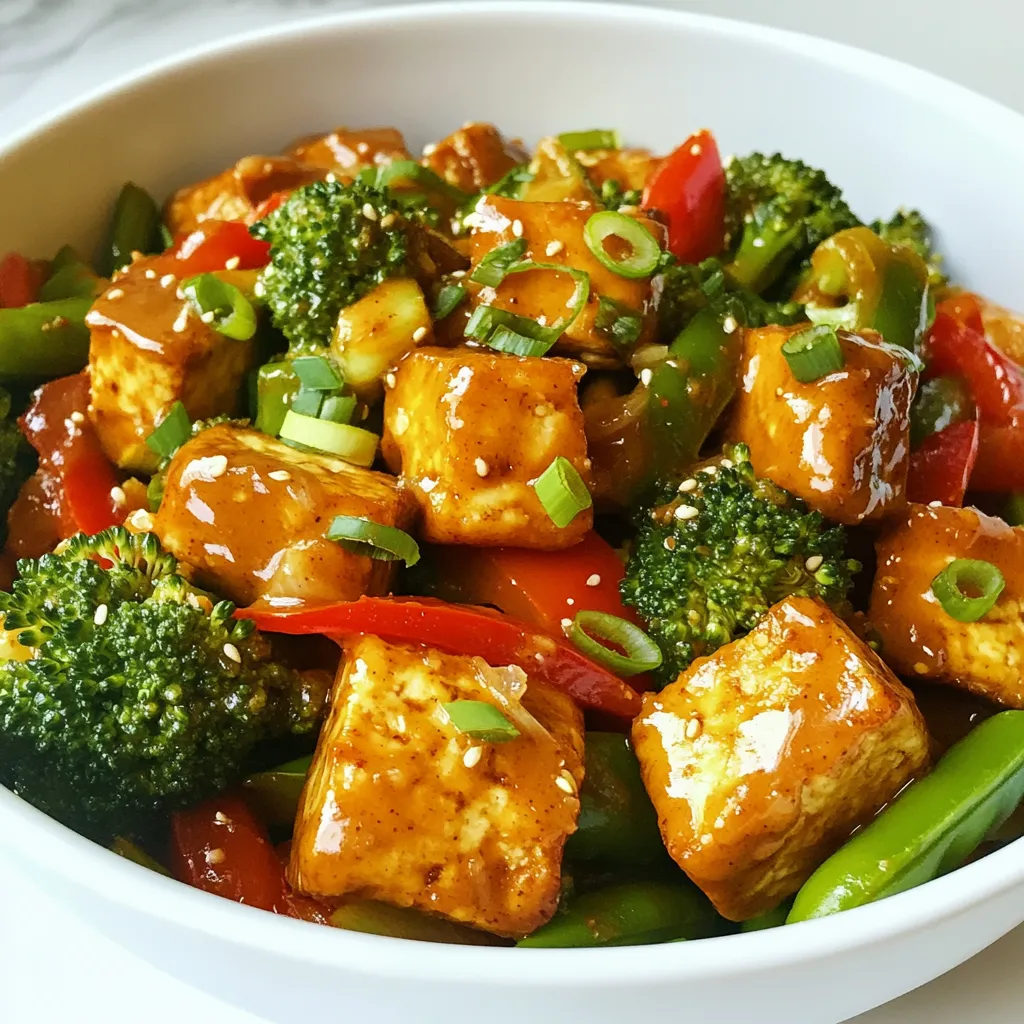 A delicious and healthy stir fry featuring crispy tofu and fresh vegetables, all coated in a rich peanut sauce.