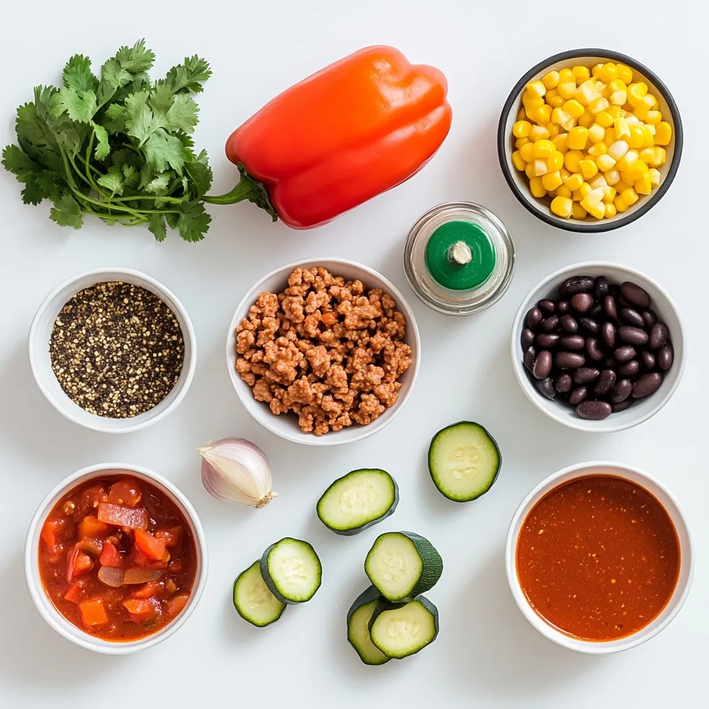 After the turkey is brown, toss in the diced bell pepper, zucchini, and corn. Stir everything together and let it cook for about 5 minutes. This softens the veggies and brings out their sweet flavors.