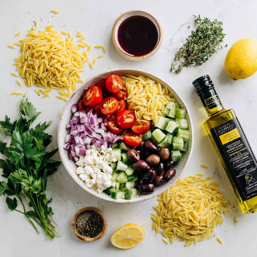 - 1 cup orzo pasta - 1 1/2 cups cherry tomatoes, halved - 1 cucumber, diced - 1 cup Kalamata olives, pitted and halved - 1/2 red onion, finely chopped - 1 cup feta cheese, crumbled - 1/3 cup extra virgin olive oil - 2 tablespoons red wine vinegar (or lemon juice for a twist) - 1 tablespoon fresh oregano, chopped (or 1 teaspoon dried) - 1 tablespoon fresh parsley, chopped - Salt and pepper to taste - Zest of 1 lemon Now, let’s dive into the tasty ingredients that make this salad a hit. First, I use orzo pasta, which is small and rice-like. It soaks up all the flavors well. Cherry tomatoes add a sweet burst. I slice them in half for easy eating. Then, I dice a fresh cucumber. It gives a nice crunch and freshness. Kalamata olives bring a briny bite. I always pit and halve them for a perfect mix. Next, I chop a half red onion finely. This step makes sure the onion flavor isn’t too strong. Feta cheese is must-have in this dish. I crumble it on top for a creamy finish. For the dressing, I whisk together extra virgin olive oil and red wine vinegar. You can also swap the vinegar for lemon juice if you want. I add lemon zest for a bright touch. Fresh herbs like oregano and parsley are key. They add depth and aroma. Finally, I season with salt and pepper to taste. Each ingredient plays a part in making this salad fresh and flavorful. {{ingredient_image_1}} To start, bring a large pot of salted water to a boil. Add one cup of orzo pasta. Cook it according to the package instructions until it is al dente. This usually takes about 8 to 10 minutes. When done, drain the orzo. Rinse it under cold water to stop the cooking process. This helps keep the orzo firm. Set it aside to cool completely. Now, let’s chop some fresh veggies. Take 1 and 1/2 cups of cherry tomatoes and slice them in half. Next, dice one cucumber into small pieces. Then, grab one cup of Kalamata olives, pit them, and cut them in half. Finally, finely chop half of a red onion. In a large mixing bowl, combine all these veggies and stir well. For the dressing, whisk together 1/3 cup of extra virgin olive oil and 2 tablespoons of red wine vinegar (or use lemon juice for a twist). Next, add the zest of one lemon, 1 tablespoon of fresh oregano, and 1 tablespoon of fresh parsley. Season the mix with salt and pepper. Keep whisking until everything is well combined. This dressing adds a bright, zesty flavor to your salad. Now it's time to bring everything together. Add the cooled orzo to the bowl with the fresh vegetables. Pour the zesty dressing over the salad. Toss gently until all ingredients are well coated. Then, carefully fold in one cup of crumbled feta cheese. Be gentle so the feta stays in nice chunks. Chilling is key for great flavor. Allow the salad to chill in the fridge for at least 30 minutes. This helps the flavors meld together. Toss the salad once more before serving. Enjoy the fresh, vibrant taste of your Zesty Greek Orzo Salad! To boost the flavor, try adjusting the salt and pepper. A pinch of smoked paprika adds a nice kick. You can also swap red wine vinegar for lemon juice for a fresher taste. If you like heat, a dash of red pepper flakes works well. This salad pairs beautifully with grilled chicken or fish. You can serve it alongside pita bread and hummus for a complete meal. For a lovely presentation, use a large, shallow dish. Sprinkle fresh herbs like parsley on top for color. If you want to prep in advance, cook the orzo and chop the veggies a day before. Store them separately in the fridge. Mix them right before serving to keep everything fresh. The salad stays good for up to three days in the fridge if you keep it covered. Pro Tips Cook Orzo Al Dente: Ensure the orzo is cooked al dente for a firm texture that holds up well in the salad. Use Fresh Herbs: Fresh oregano and parsley will elevate the flavor of the salad, making it more aromatic and vibrant. Chill for Flavor: Letting the salad chill for at least 30 minutes allows the flavors to meld beautifully, enhancing the overall taste. Customize Ingredients: Feel free to add other vegetables or proteins, like bell peppers or grilled chicken, to make it your own. {{image_2}} You can boost your Zesty Greek Orzo Salad by adding protein. Grilled chicken adds flavor and heartiness. Shrimp also works well and brings a nice touch. If you prefer plant-based options, chickpeas are an excellent choice. They add protein and fiber without meat. Make your salad shine with seasonal veggies. In summer, try bright bell peppers or fresh zucchini. In fall, roasted root vegetables add depth. You can also tweak the dressing. Use fresh herbs like basil in summer or thyme in spring. This keeps your salad fresh and exciting all year round. If you need a gluten-free option, seek gluten-free orzo. Many brands now offer rice-based or corn-based varieties. For vegan diets, swap feta cheese with crumbled tofu or a plant-based cheese. This keeps the salad creamy while fitting your dietary needs. To store your Zesty Greek Orzo Salad, use an airtight container. Glass or plastic containers work well. Make sure to seal the lid tightly. This keeps the salad fresh and prevents strong odors from other foods in the fridge. You can store the salad in the fridge for up to three days. After that, the veggies may start to get mushy. You can freeze orzo salad, but it may change a bit. To freeze, place it in a freezer-safe container. Leave some space at the top since it will expand. When you want to eat it, thaw the salad in the fridge overnight. This helps keep the flavors. Be aware that freezing may make the veggies softer. The feta cheese might also lose some of its creaminess. Zesty Greek Orzo Salad can last about 3 to 5 days in the fridge. To keep it fresh, store it in an airtight container. Make sure to seal it well to keep moisture out. If you notice any change in smell or color, it’s best to throw it away. To extend freshness, consider adding the feta cheese just before serving. This keeps it 